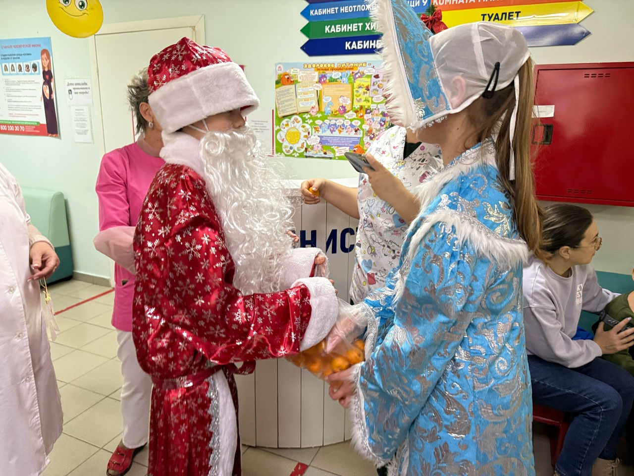 Наши ребята, нарядившись в костюмы Деда Мороза и Снегурочки, отправились поздравлять тех, кто работает в новогоднюю ночь, спасая миллионы жизней — врачей!